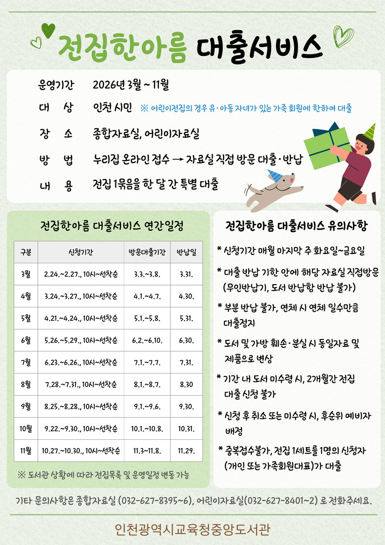 자세한 사항은 중앙도서관 누리집을 확인하거나 종합자료실(☎ 032-627-8395~6) 및 어린이자료실(☎032-627-8401~2)로 문의하면 된다.