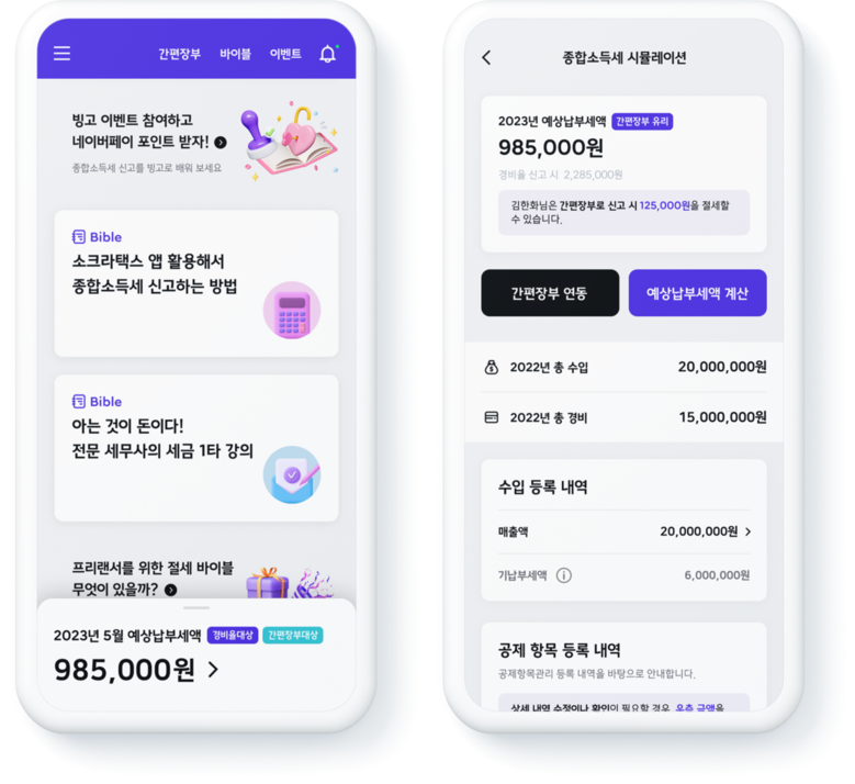이용방법은 「소크라택스」앱에 접속해 ‘소득구간별 경비인정비율’, ‘거래입증을 위한 필요경비 증빙방법’ 등을 확인 후, 전년도 수입과 지출, 공제항목을 꼼꼼히 입력하면 된다. 시뮬레이션 서비스를 통해 예상 납부세액을 바로 확인 가능하며, 절세 방법도 안내 받을 수 있다.
