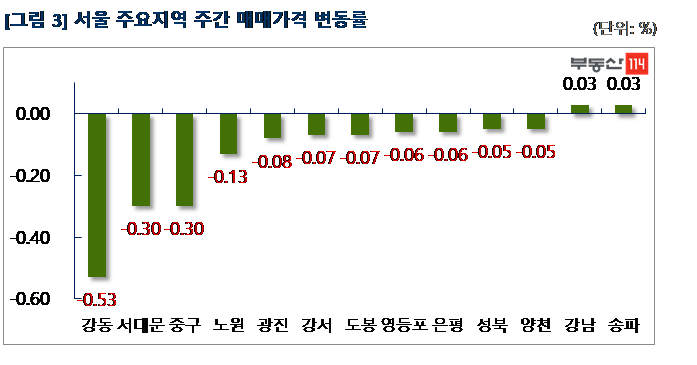 서울은 ▼강동(-0.53%) ▼서대문(-0.30%) ▼중구(-0.30%) ▼노원(-0.13%) ▼광진(-0.08%) ▼강서(-0.07%) ▼도봉(-0.07%) ▼영등포(-0.06%) ▼은평(-0.06%) 순으로 떨어졌다. 강동은 고덕동과 상일동 일대 대규모 아파트 입주시기가 코앞에 다가오면서 주변 일반아파트의 약세가 두드러졌다. 상일동 고덕숲아이파크가 2,500만원, 암사동 롯데캐슬퍼스트가 2,500만원-1억원 떨어졌다. 서대문은 매물이 전반적으로 쌓여있는데 수요자의 문의는 더 희소해진 상황이다. 남가좌동 DMC파크뷰자이가 3,500만원 빠졌다. 중구는 황학동 롯데캐슬베네치아가 4,000만원, 노원은 중계동 중계2차한화꿈에그린더퍼스트와 경남아너스빌이 1,000만원-3,500만원 하락했다. 반면 △송파(0.03%) △강남(0.03%)은 주요 재건축단지의 급매물이 줄어들면서 상승했다. 송파는 잠실동 주공5단지가 3,500만원-5,500만원, 강남은 대치동 은마아파트와 개포동 주공고층7단지가 2,500만원-5,000만원 올랐다.