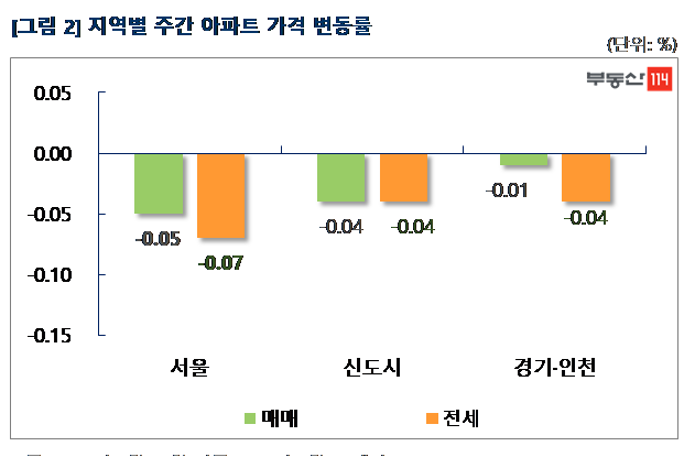 전세가격은 강동구 전셋값 낙폭이 크게 확대되면서 서울이 0.07% 떨어졌고, 신도시(-0.04%)와 경기ㆍ인천(-0.04%) 모두 약세를 이어갔다.