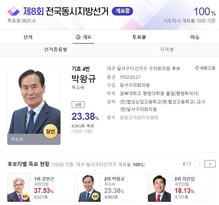 [세계타임즈 백진욱 기자] 무소속 박왕규 후보가 제 8회 전국동시지방선거 대구 달서구다선거구에서 구의회의원으로 당선됐다.