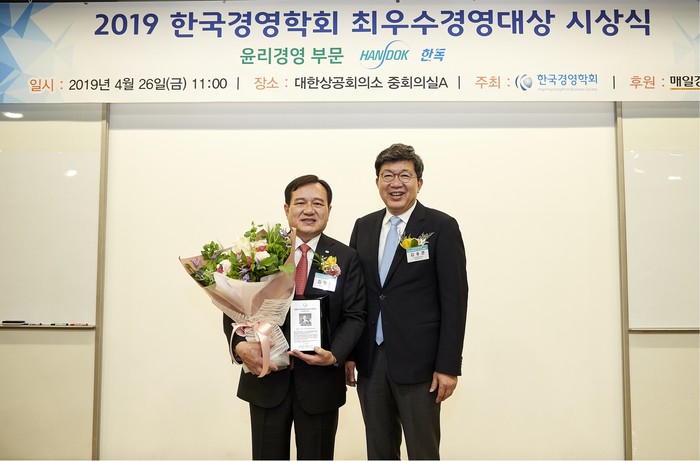 | ▲한독이 4월 26일 서울시 중구 대한상공회의소에서 개최된 ‘2019 한국경영학회 최우수경영대상’ 시상식에서 ‘경영학자들이 선정한 대한민국 최우수경영대상 윤리경영 부문’을 수상했다. (좌측)김영진 한독 회장, (우측)김용준 한국경영학회 회장 |