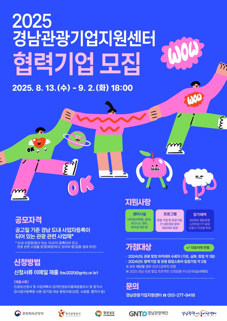 김상원 경남도 관광개발국장은 “이번 협력기업 모집을 통해 도내 관광기업들의 성장을 지원하고, 기업 간 협업을 통한 새로운 관광 비즈니스 모델 창출에 기여하고자 한다”라며, “혁신적인 아이디어를 가진 많은 관광기업들의 적극적인 참여를 바란다”라고 말했다.