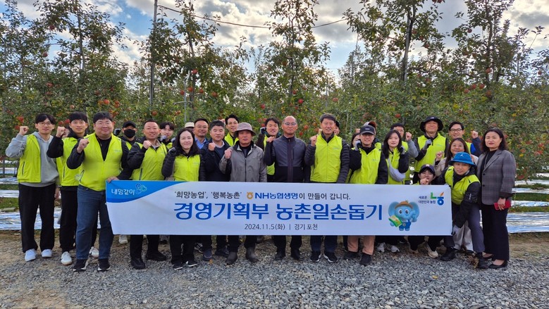 금번 농촌일손돕기는 ▲농협생명 김재춘 경영기획부문 부사장 ▲ 경영기획부 임직원 23명이 참여했다. 농협생명 임직원은 수확철을 맞아 인력난을 겪고 있는 농가에 보탬이 되고자 사과수확과 함께 농원 주변을 정리하며 구슬땀을 흘렸다.