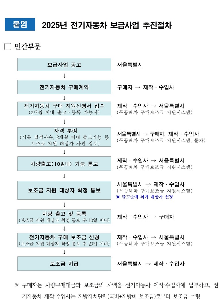 신청대상은 접수일 기준 서울시에 30일 이상 거주하거나 사무소를 둔 개인·개인사업자·법인·공공기관 등으로, 2개월 이내 출고 가능한 차량만 신청할 수 있다. 구매자는 자동차 제작‧수입사와 구매계약을 체결하고, 제작·수입사가 서울시로 보조금을 신청하는 방식으로 진행된다.