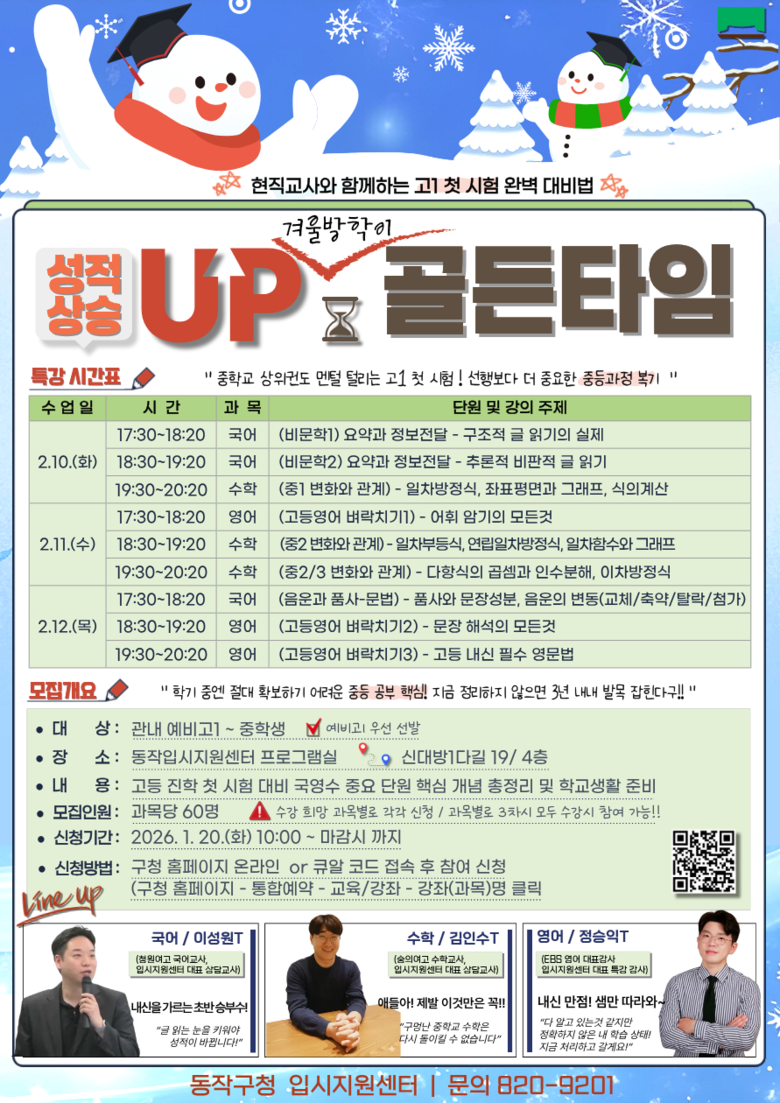 박일하 동작구청장은 “이번 특강은 고교 진학 후 새로운 환경에서 첫 시험을 앞둔 학생들이 변화에 대비하도록 돕기 위한 것”이라며, “특강을 통해 학습의 골든타임을 놓치지 않고 자신 있게 고교 생활을 시작하길 바란다”고 말했다.