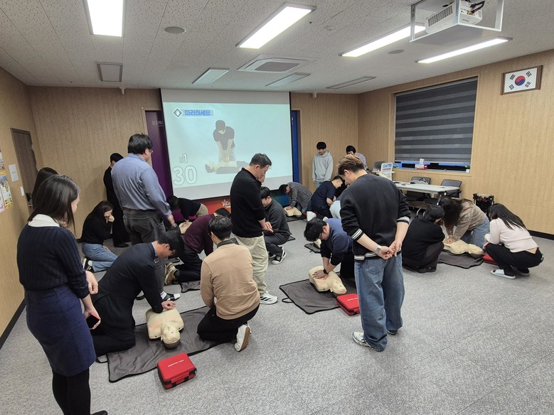 교육은 재단 대회의실에서 진행되었으며, 직원들은 다양한 사례를 바탕으로 △올바른 소화기 사용법 △상황별 응급처치 방안 △심폐소생술(CPR)방법 △자동제세동기(AED) 사용법 등을 이론으로 학습한 뒤, 마네킹과 자동제세동기(AED) 장비를 이용해 실습을 진행했다.