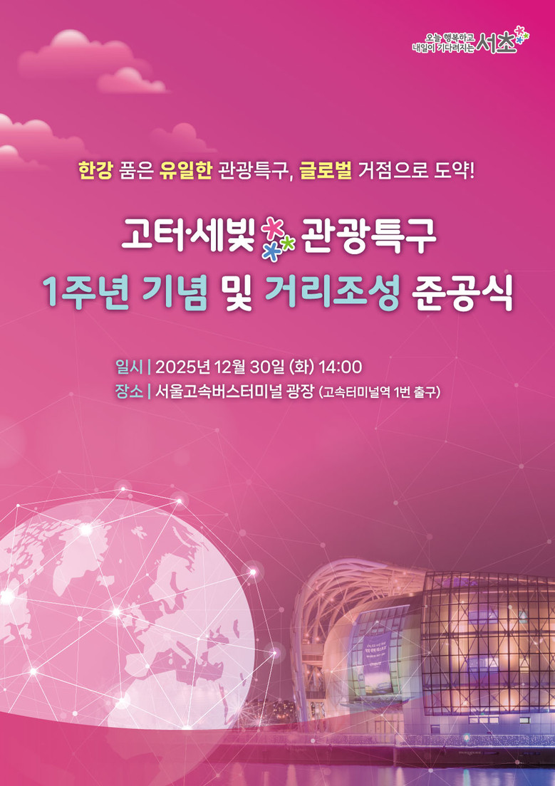 - 전성수 구청장, “한강 자원을 활용한 콘텐츠를 확충해, 누구나 편리하게 찾고 국내·외 관광객이 다시 찾는 글로벌 관광거점으로 성장시켜 나갈 것” [서초구 세계타임즈=이장성 기자] 서울 서초구(구청장 전성수)는 고터·세빛 관광특구 지정 1주년을 맞아 오는 30일 14시 서울고속터미널 광장 일대에서 관광특구의 본격적인 도약을 알리는 「고터·세빛 관광특구 1주년 기념 및 거리조성 준공식」을 개최한다고 밝혔다.