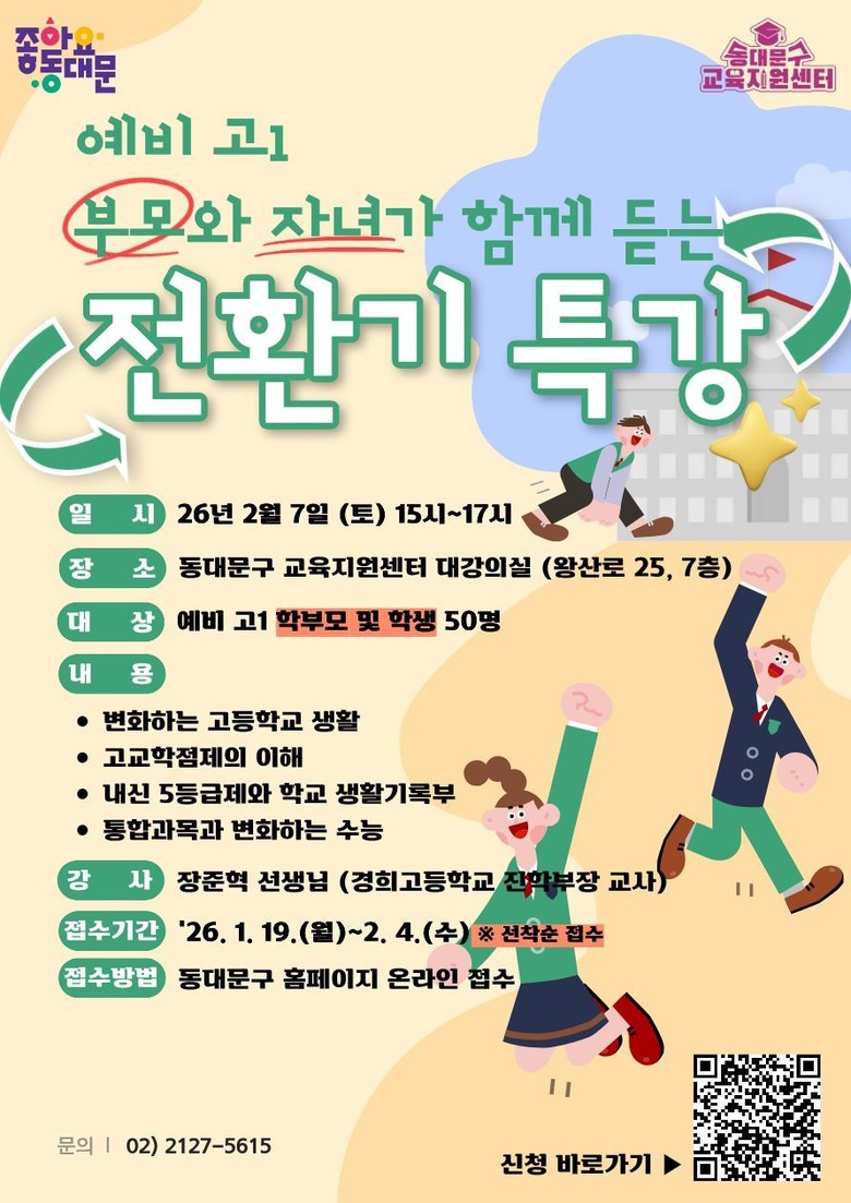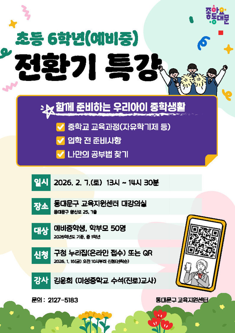 이필형 동대문구청장은 “전환기 교육은 학생들의 학교생활 적응과 진로 설계에 매우 중요한 과정”이라며 “이번 프로그램을 통해 학생들이 겪을 혼란을 줄이고, 변화하는 교육환경 속에서도 스스로 방향을 설정하며 안정된 학교생활을 이어갈 수 있는 힘을 기를 수 있기를 기대한다”고 밝혔다.