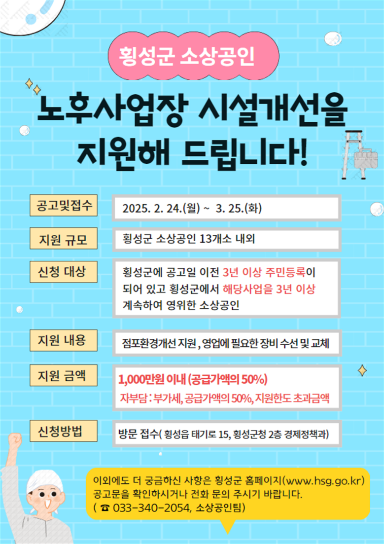 사업장 건물과 시설물 개량 및 수리, 사업에 필요한 장비·비품 교체 등을 지원하며 부가가치세를 제외하고 사업비의 50%, 최대 1,000만 원까지 지급한다.