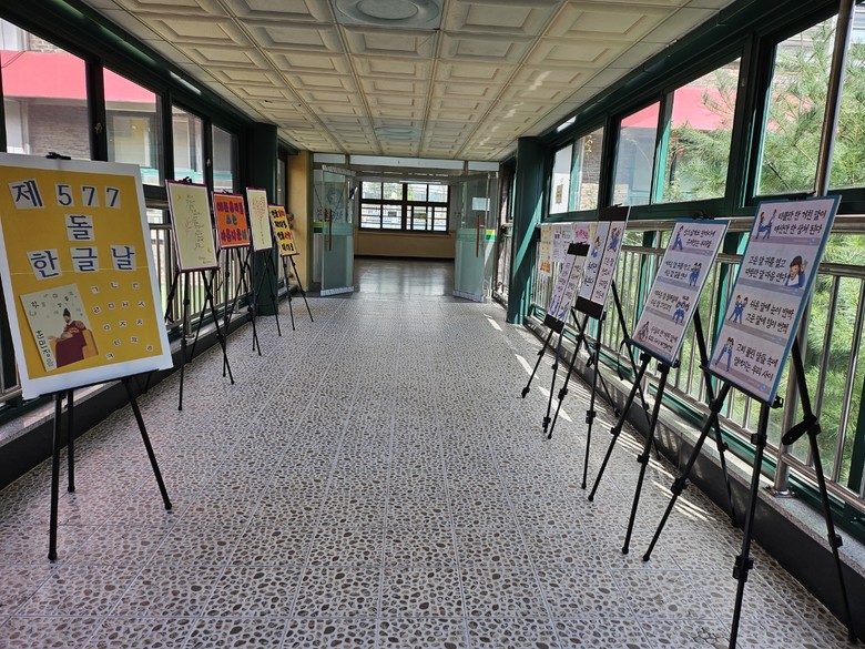 10월 4일부터 3일 동안 본관 2층 구름다리 전시장에 한글의 소중함과 바른 사용에 대한 문구와 아름다운 한글의 활용을 소개하기 위한 표어 작품들을 전시하여 전교생이 한글의 소중함과 아름다움을 경험하도록 하였다. 이어 10월 6일 금요일 아침 등교 시간에 학생들에게 한글을 바르게 사용하자는 홍보 활동과 함께, 세종대왕으로 분장한 학부모가 준비한 선물도 함께 나누었다.