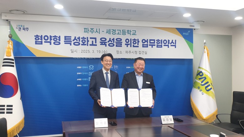 [파주시 세계타임즈=송민수 기자] 세경고등학교(교장 장계홍)는 파주시(시장 김경일)와 협약형 특성화고 육성을 위한 협약식을 3월 19일에 개최했다. 이번 협약식은 협약형 특성화고등학교 육성을 위한 상호 협력과 지자체와 함께 인재를 양성하고자 하는 데에 그 목적이 있다.