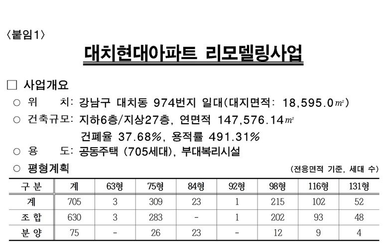 ① 대치현대아파트 리모델링: 630세대 → 705세대 확대, 스마트시니어센터·개방형독서실 조성