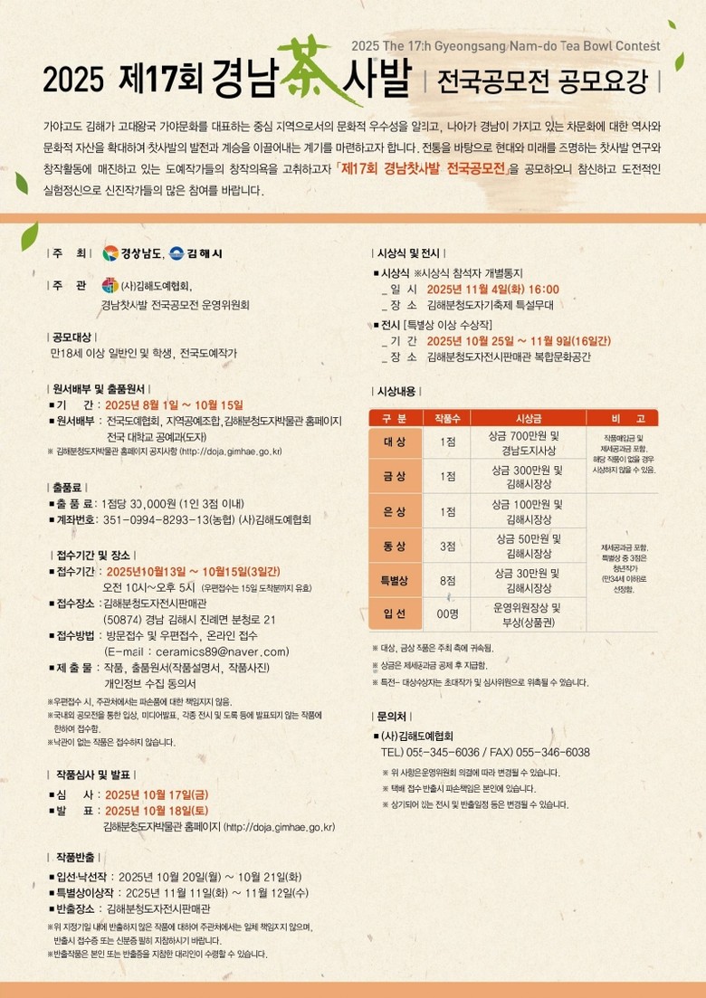 결과는 10월 18일 김해분청도자박물관 홈페이지를 통해 발표되며, 대상(1점)에는 도지사상과 상금 700만 원이 수여되는 등 총 14점 내외의 작품이 수상의 영예를 안게 된다.