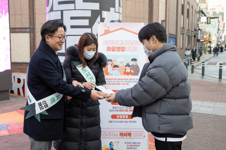 가스공사 직원들은 캠페인을 통해 지역 주민들에게 겨울철 도시가스 절약 캐시백 제도 및 에너지 절약 실천 요령을 안내하고 수면양말 등 방한 물품을 배부했다.