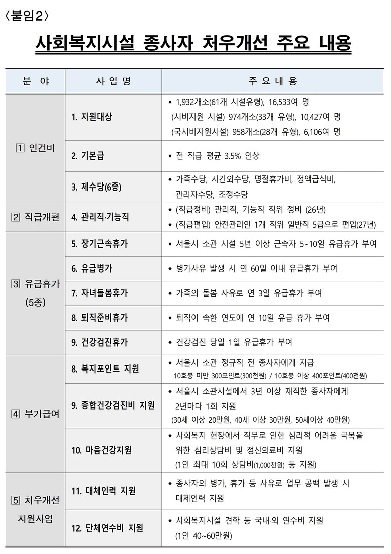 서울시는 「2026년 사회복지시설 종사자 처우개선 계획」을 마련하고 종사자에 대한 처우개선으로 복지서비스의 질을 높여나가겠다고 밝혔다. 이번 계획에는 ▴현장 의견을 적극 반영한 직급.호봉.수당 체계 정비 ▴특정 직급 소외를 막는 관리직급 개편 등이 담겼다.