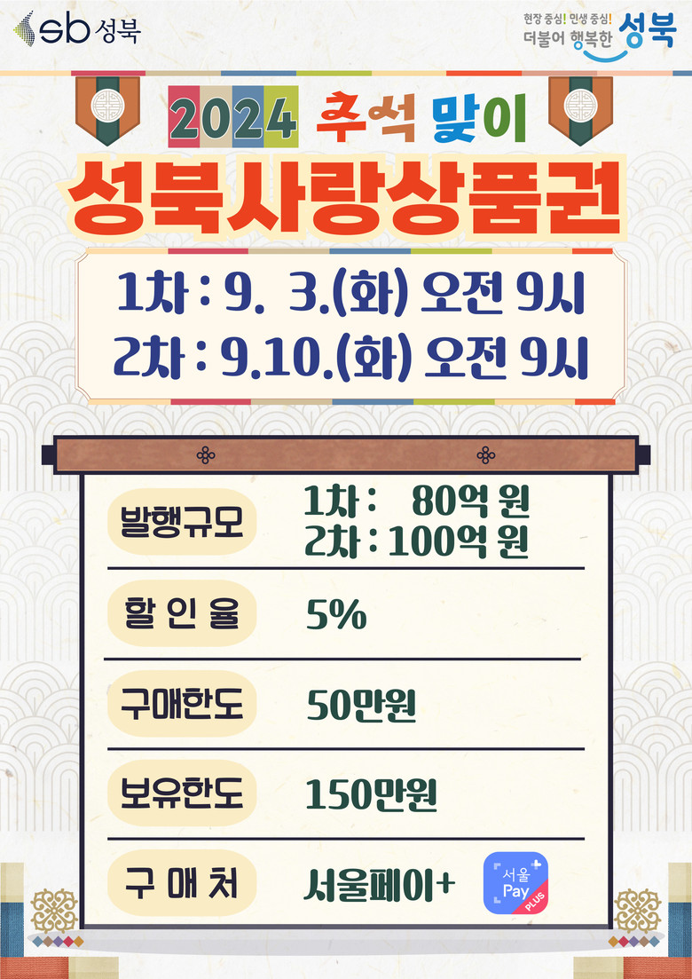 - 새로워진 서울페이플러스 앱으로 더 다양해진 혜택을 누릴 수 있어 [성북구 세계타임즈=이장성 기자] 서울 성북구(구청장 이승로)가 추석 명절을 맞아 9월 1차, 2차에 나누어 청 180억 규모의 ‘성북사랑상품권’을 발행한다. 특히 9~10월에는 상품권을 사용하면 5%를 다시 모바일 상품권으로 환급해 주는 페이백 행사까지 더해져 10%의 할인율을 체감할 수 있어 눈길을 끈다.