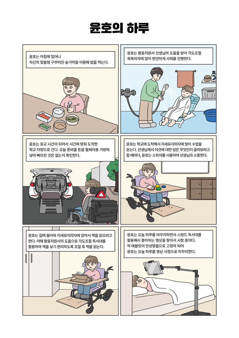 이해를 돕기 위해 휠체어 이동, 신변처리 방법 등 그림으로 10건, 보조기기 실제 이용 사례 웹툰 5건, 장애인콜택시, 저상버스 이용 방법 등 사례 2건을 삽화로 제작하여 삽입하였다.