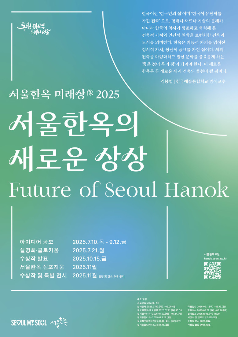 - 시, 10월 수상자 발표, 11월 서울한옥 미래상 심포지엄·영상제작·전시·작품집 예정 [서울 세계타임즈=이장성 기자] 서울시는 깊은 역사를 품은 한옥이 현대 도시의 숨결 속에서 어떻게 피어날 수 있을지, 그 미래를 함께 그려나갈 ‘제1회 서울한옥 미래상像 디자인 아이디어 공모전’을 개최한다.