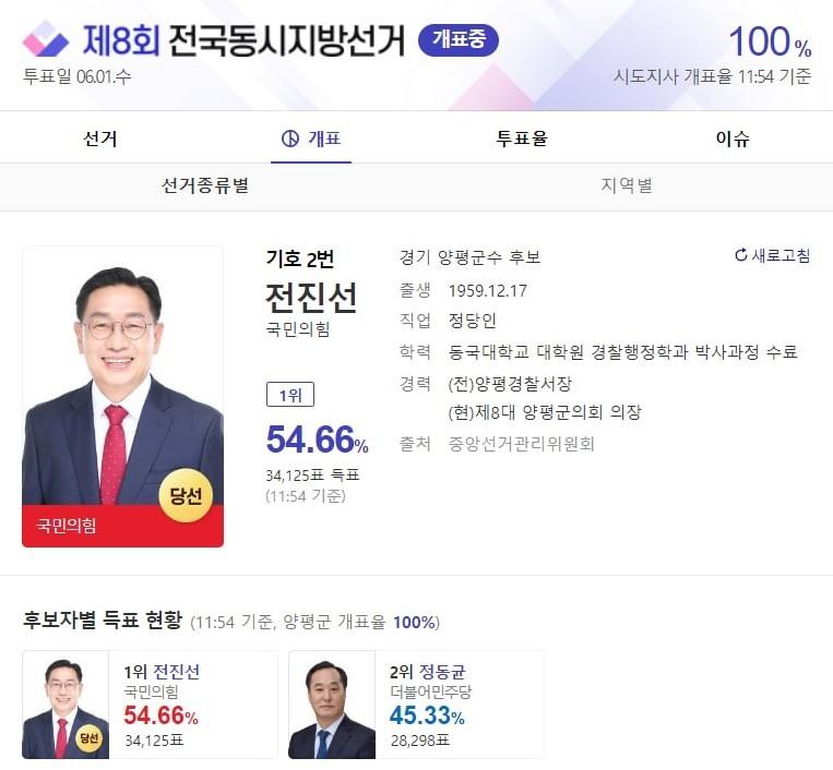 [포토] 국민의 힘 전진선, 54.66% 득표율로 경기 양평군수 당선