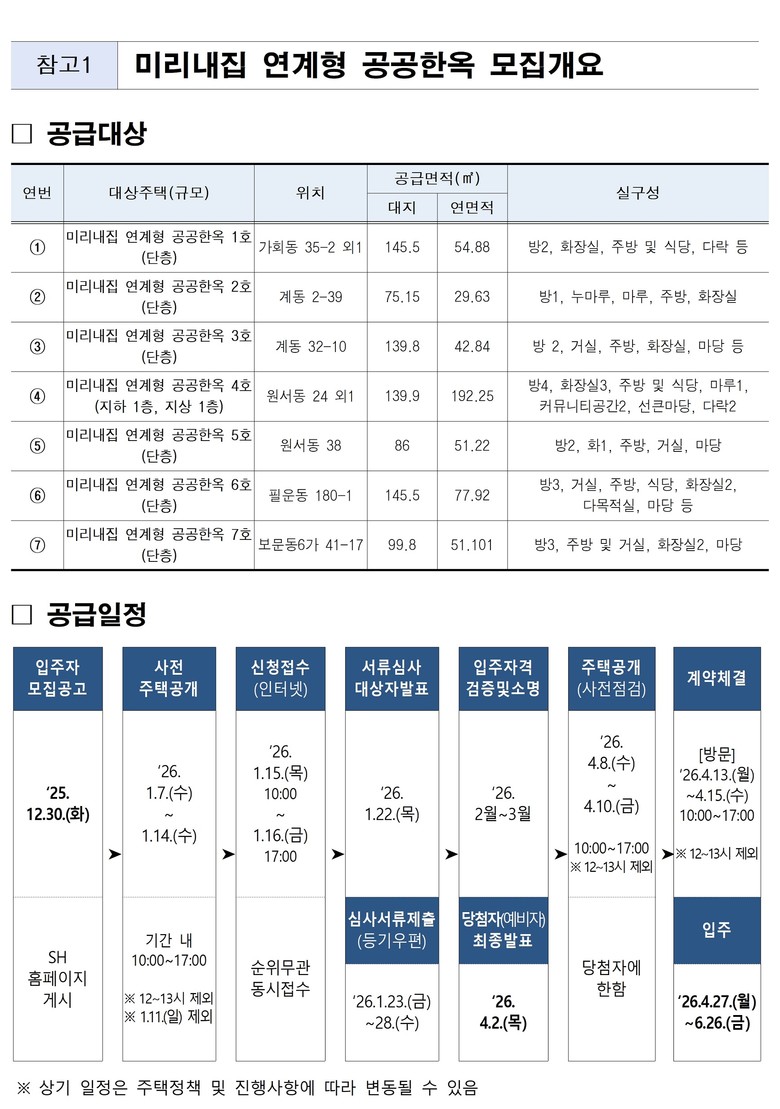 서울시는 12.30.(화) ‘미리내집 연계형 공공한옥’ 입주자 모집을 공고하고, 1.15.(목)~16.(금) 양일간 신청받는다고 밝혔다. 종로.성북구에서 총 7가구 공급되며, 1.7.(수)~1.14.(수)(일요일 제외) 실제 공급될 한옥을 둘러볼 수 있는 개방행사를 열고 1.12.(월)에는 현장 설명회도 개최한다.