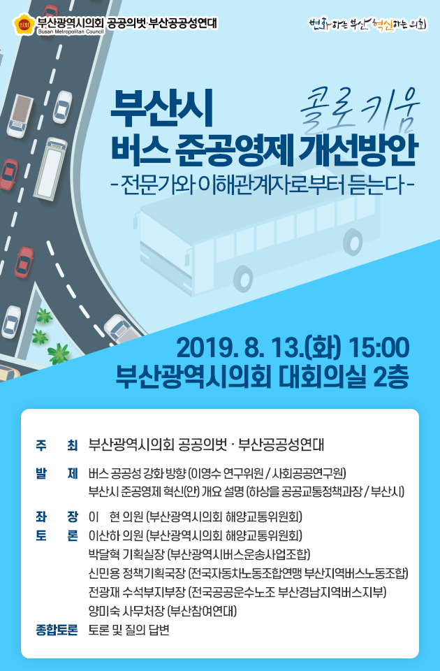 이에 따라 시의회 의정포럼 ‘공공의 벗’과 ‘부산공공성연대’가 주최가 되어 오는 13일 시의회 대회의실에서 버스운송사업조합과 노조, 시민단체 전문가 등으로 구성된 공공의 논의의 장을 마련하는 콜로키움*을 개최한다고 밝혔다.