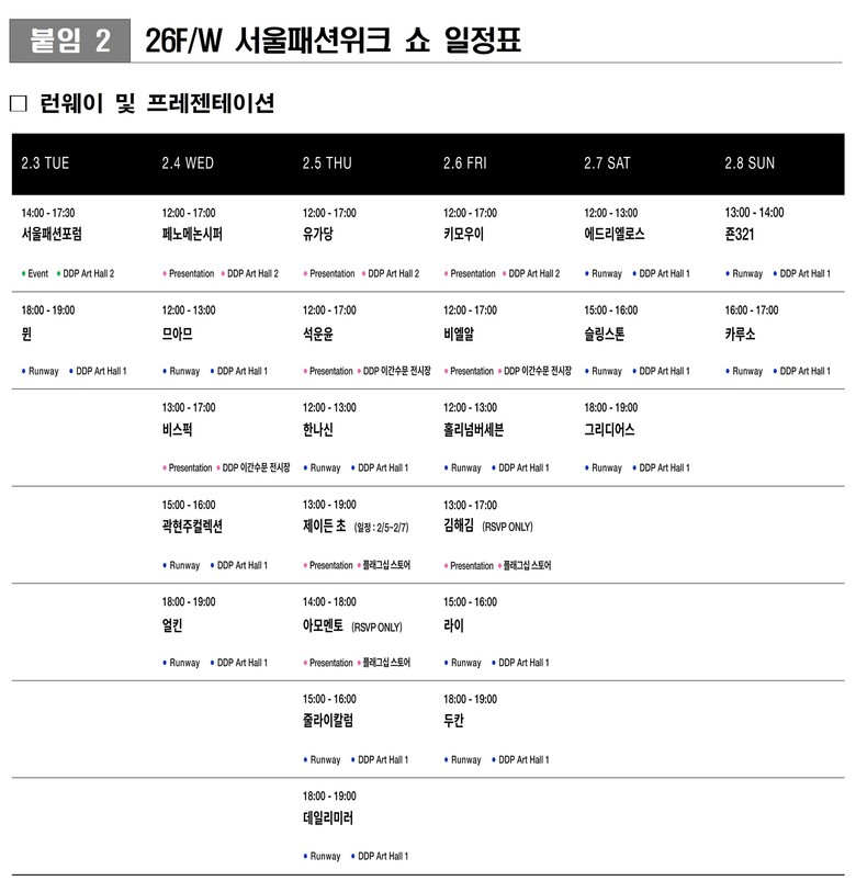 9개 브랜드가 참여하는 프레젠테이션은 DDP 아트홀 2관, 이간수문 전시장 등 DDP 내부 공간과 브랜드별 개별 쇼룸을 연계해 진행한다, 이를 통해 바이어(B2B)와 일반 관람객(B2C) 모두 브랜드 콘셉트와 상품 구성을 다각도로 확인할 수 있으며, 일부 브랜드는 청담·북촌 등 주요 패션 거점의 개별 쇼룸에서 프레젠테이션을 진행해 현장성과 브랜드 정체성을 강화한다.
