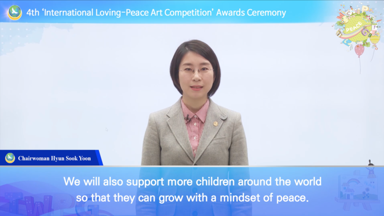 윤현숙 대표는 인사말을 통해 “올해의 그림 주제는 ‘평화의 빛으로 하나되는 지구촌’이다. 이번 수상작들의 예술성과 창의성이 매우 뛰어나고, 그림에 담긴 평화의 메시지로 인해 마음에 감동을 받았다”며 “우리는 지금 어느 때보다도 평화가 절실한 시기에 살고 있다. 평화를 이루기 위해서는 전쟁이 아니라 평화가 당연한 것임을 일깨우고 평화문화를 전 세계에 전해야 한다. 그림에 펼쳐진 세상처럼 평화의 문화로 지구촌이 하나되는 그날이 하루속히 완성되기를 소망한다”라고 말했다.