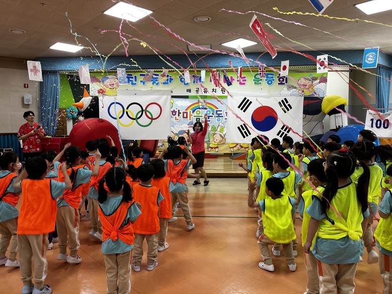5월 7일(화)~5월 9일(목)은 연령별 한마음 운동회를 개최하였다. 태극기와 오륜기가 휘날리는 강당에 씩씩하게 입장하여 준비체조를 하고 선서문 낭독 후 원장선생님의 개회 선언으로 시작이 되었다. 개인 달리기, 색판 뒤집기, 볼풀공 서바이벌, 바람 잡는 특공대, 에펠탑 쌓기, 택배왔어요, 릴레이 경주 등 유아와 교사가 함께 하는 다양한 게임으로 구성되었으며 모두 한마음이 되어 서로를 응원하였다. 유아, 교사들이 함께 웃고 즐길 수 있는 시간으로 환호성과 웃음소리가 끊이지 않았으며 팀이 하나가 되어 안전하고 협력하는 배움과 성장이 있는 시간이었다.
