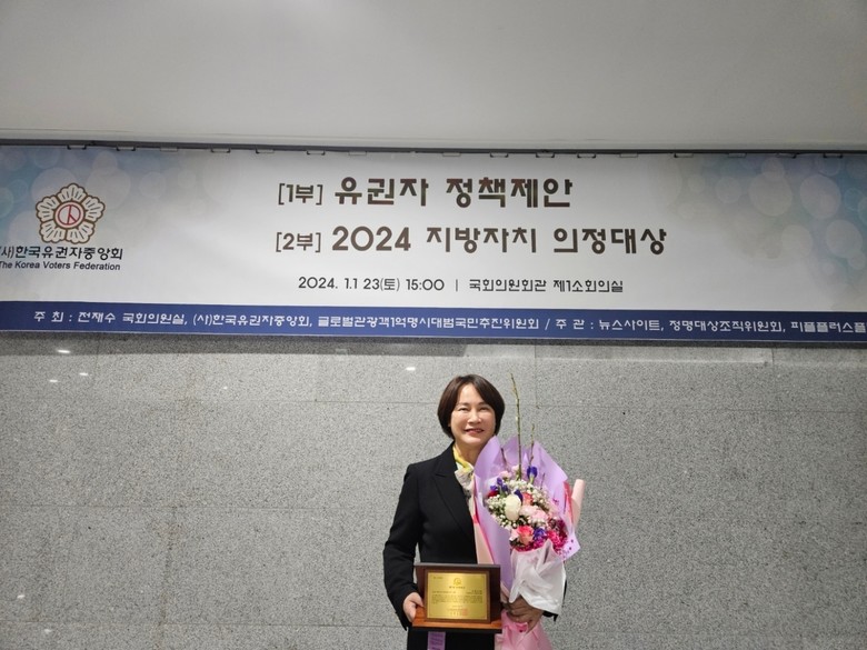[남동구 세계타임즈=심하린 기자] 남동구의회 이정순 의장(더불어민주당/간석2‧3동, 구월2동)은 지난 23일 국회의원회관 제1소회의실에서 열린 ‘유권자 정책제안 및 제7회 정명대상 지방자치 의정대상시상식’에서 ‘지방자치 의정대상’을 수상했다.