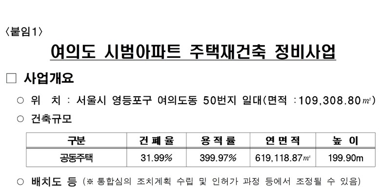 최진석 서울시 주택실장은 “여의도 대표적인 대단지인 시범아파트가 한강과 어우러진 새로운 주거단지로 탈바꿈한다.”며 “신속한 재건축 사업 추진으로 주택공급을 활성화하고, 시민 누구나 누릴 수 있는 열린 주거환경을 지속 확대하겠다.”고 말했다.