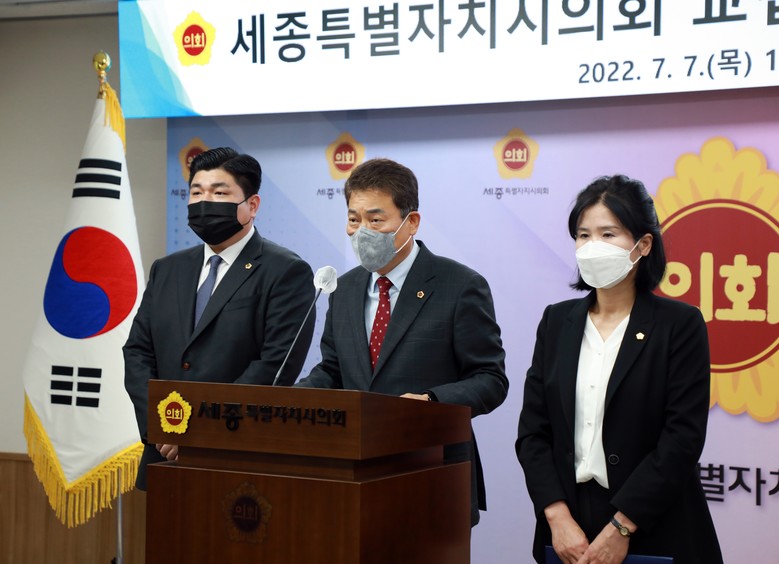 [세계타임즈=세종 이채봉 기자] 세종특별자치시의회(의장 상병헌) 교섭단체 대표단은 7일 의회청사 대회의실에서 기자회견을 열고 “여야 협치의 정신으로 시민과 약속했던 주요 현안을 해결하기 위해 힘을 모으겠다”고 밝혔다.