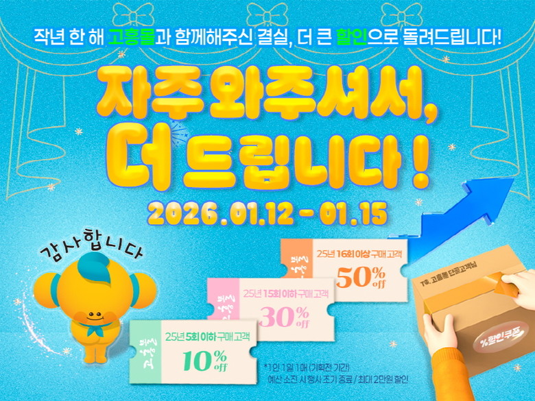 이번 기획전은 2025년 연간 최대 매출 달성을 기념하고, 그 성과에 기여한 구매 고객에게 감사의 뜻을 전하기 위해 마련됐다. 2025년 한 해 고흥몰 주문 횟수를 기준으로 고객별 차등 할인 혜택을 제공하는 것이 특징으로, 고흥몰을 꾸준히 이용해 온 단골 고객일수록 더 큰 혜택을 받을 수 있도록 설계된 고객 감사형 프로모션이다.