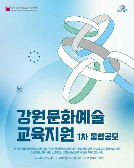 ・강원지역 문화예술교육 현장을 폭넓게 지원하는 2026년 사업 공모 실시 [강원도 세계타임즈=김민석 기자] 강원문화재단(대표이사 신현상)은 문화예술교육 활성화와 도민들의 문화예술교육 향유 기회 확대를 위한 「2026년 강원문화예술교육 지원사업」 1차 통합 공모를 27일(화) 공고한다.