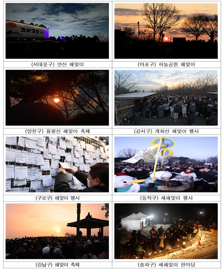 서울시는 2026년 1월 1일 각 자치구별 일출 명소인 인왕산, 안산, 개화산, 월드컵공원, 북서울꿈의숲 등 산과 공원에서 해맞이 행사를 진행한다고 밝혔다.