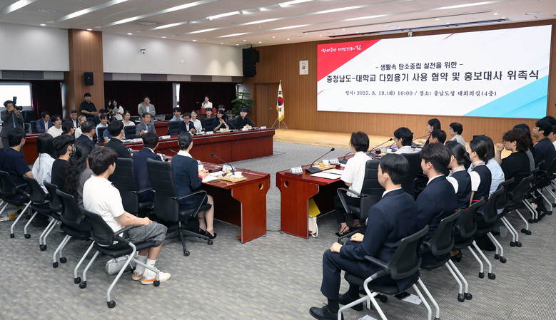 도는 19일 도청 대회의실에서 전형식 정무부지사를 비롯해 대학 총장단, 학생 홍보대사 및 관계자 등 150여 명이 참석한 가운데 ‘대학교 다회용기 사용 협약 및 홍보대사 위촉식’을 개최했다고 밝혔다.