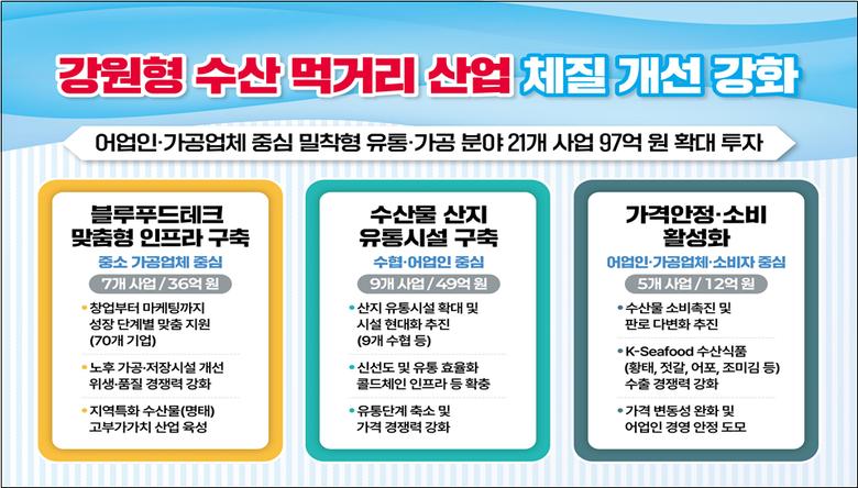 아울러 수산물 소비 기반 확대를 위해 황태, 젓갈, 어포, 조미김 등 K-Seafood 수출기업 육성과 대도시 특판전 개최를 병행하고, 어가 급락이나 일시다획 발생 시에는 수매비 일부를 지원해 시장 충격을 완화하는 등 가격 안정 장치도 강화한다.