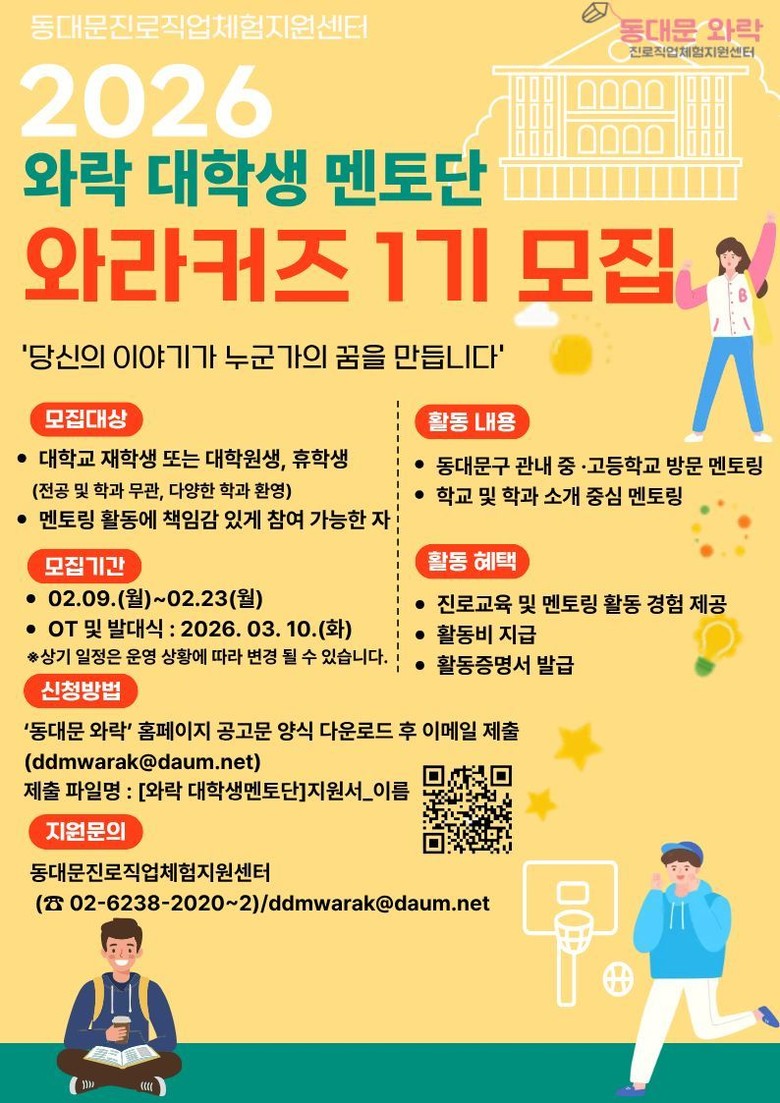 이번 모집은 동대문구 중·고등학생들에게 보다 현실적인 진로 및 학과 정보를 제공하고, 대학생 멘토들의 실제 경험을 바탕으로 진로 설계에 도움을 주고자 기획됐다. 선발된 와라커즈(WARAKERS)는 지역 내 중·고등학교를 방문해 학교 및 학과 소개를 중심으로 한 멘토링 활동을 진행할 예정이다.