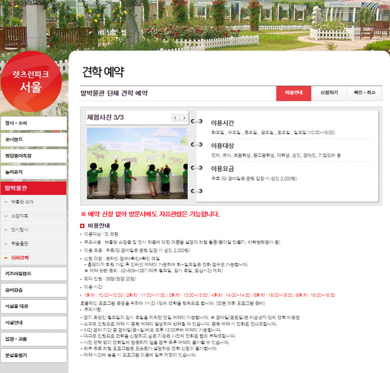 그동안 봄・가을 견학 집중 시기에 어린이집들이 동시 방문하여 체험 프로그램을 제대로 활용하지 못하거나 예약 없이 방문하여 세밀한 맞춤형 프로그램을 제공하지 못한 경우가 있었는데 예약 시스템을 운영함으로써 보다 만족스러운 이용이 기대된다. 수의과 대학의 경우, 조선시대 수의학서적과 말침, 약질이 등을 더 자세히 살펴보고, 행정 대학이나 대학원의 경우, 말 관련 행정기관과 역, 역마, 마패제도 등에 대해 상세한 설명을 들을 수 있다.