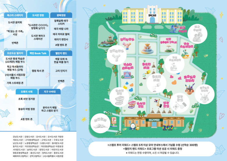 행사장은 △가족과 함께 공연과 시상식을 즐기는 북스타 스테이지, △도서관별 체험 부스가 마련된 오순도순 빌리지, △광복 80주년을 기념하는 광복 정원, △생태전환 교육을 담은 초록의 서재와 지구 수비대, △휴식과 독서를 함께 즐길 수 있는 책멍 Book Talk 힐링존 등 총 8개 구역으로 꾸며진다.