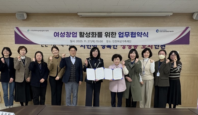 [인천 세계타임즈=심하린 기자] 인천광역여성새로일하기센터(센터장 김정민)와 인천신용보증재단 인천소상공인종합지원센터(센터장 유지원)가 11월 27일(목), 인천여성가족재단 복합미디어실에서 여성창업 활성화를 위한 업무협약(MOU)을 체결했다.