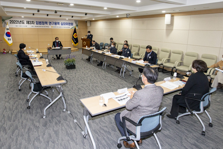 [경북 세계타임즈=한성국 기자] 경상북도의회는 12. 8.(목) 의회 다목적실에서 2022년도 제3차 입법정책 연구용역 심의위원회를 개최하여, 각 연구단체로부터 제안된 2건의 연구과제에 대해 심도 있게 논의했다.