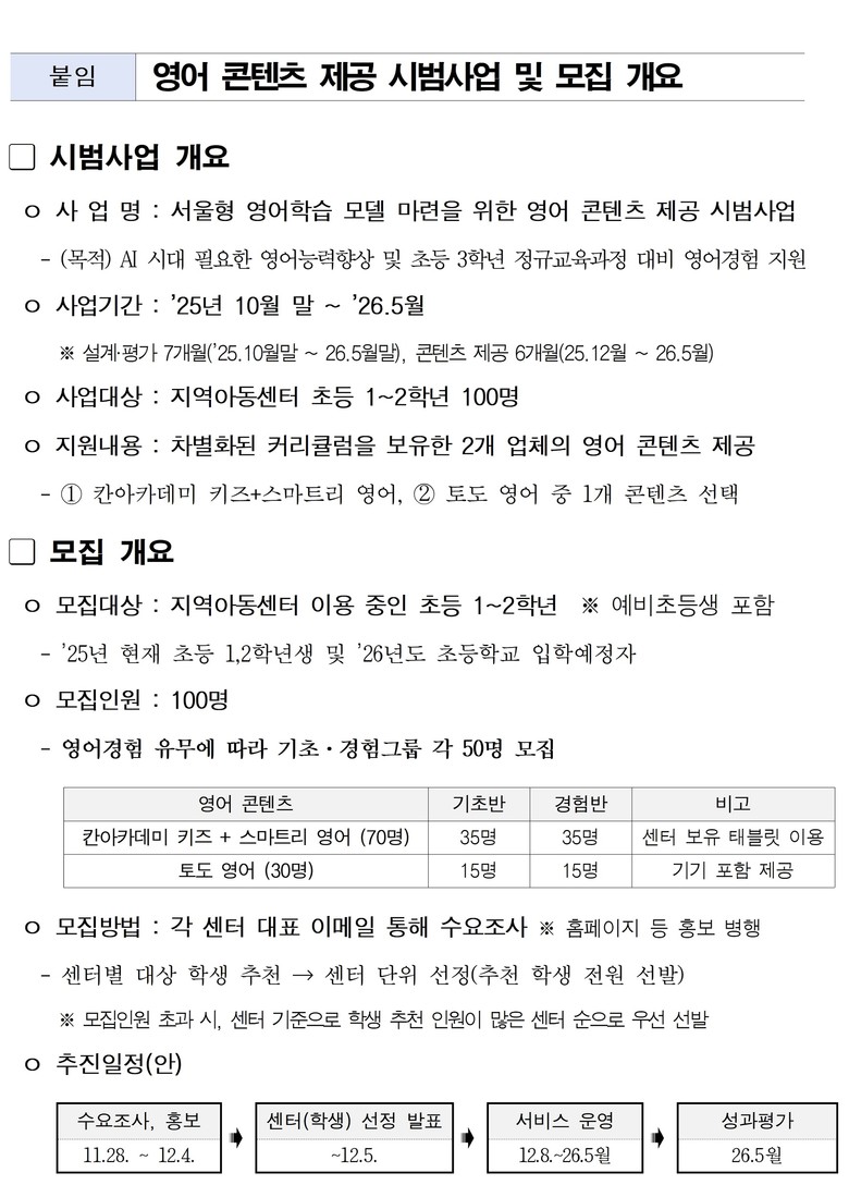 ‘서울형 영어교육’ 참여를 원하는 지역아동센터는 11월 28일(금)부터 12월 4일(목)까지 센터별 추천 아동 명단을 취합해 대표 이메일로 접수하면 된다. 대상은 센터를 이용 중인 2025년 현재 초등 1~2학년 및 2026학년도 입학 예정 아동 총 100명이다.