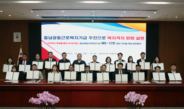 도는 30일 도청 대회의실에서 천안·금산·홍성·예산·서산·태안·보령 등 7개 시군과 ‘충남공동근로복지기금 제9∼12호 추진 업무협약’을 체결했다.