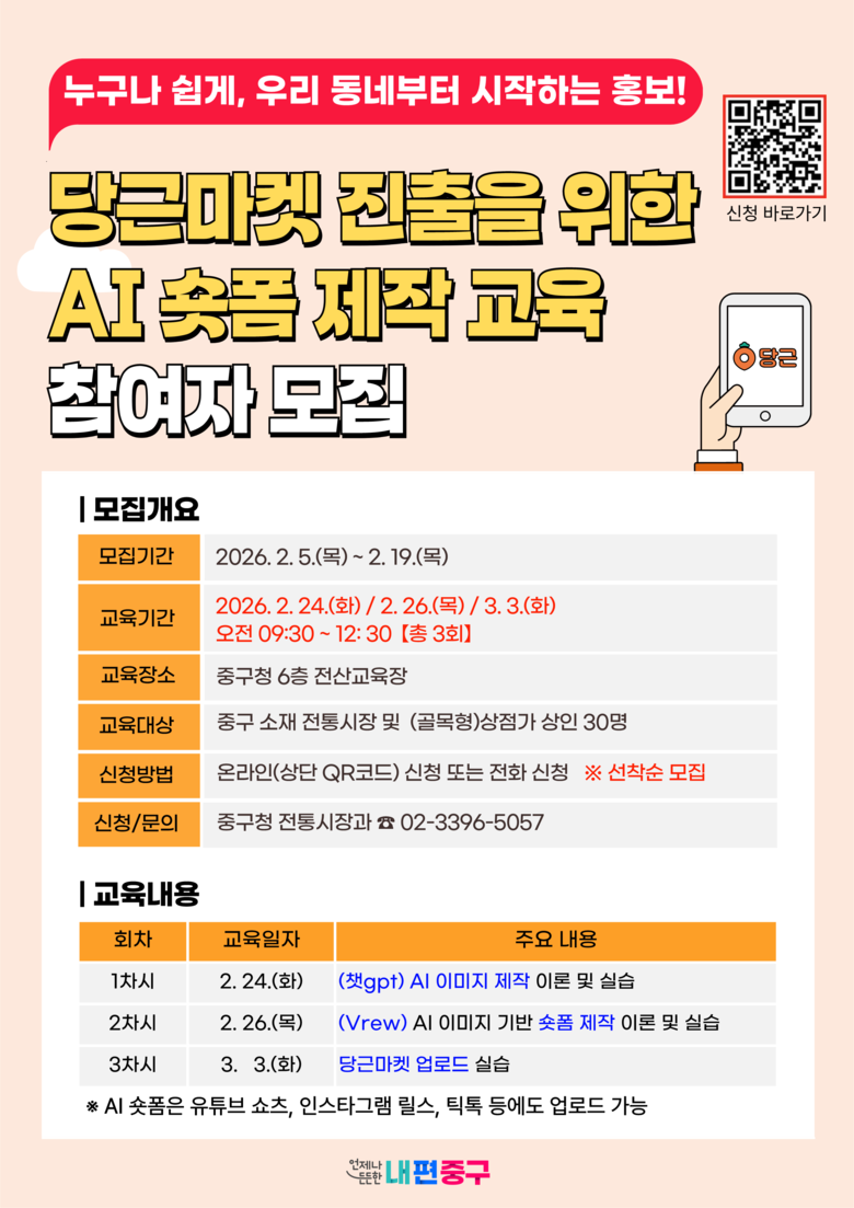 ㅇ 라이브커머스 ·SNS홍보 등 디지털 전환 교육으로 전통시장 자생력↑ [중구 세계타임즈=이장성 기자] 서울 중구가 전통시장과 골목형상점가 상인을 대상으로 「당근마켓 AI 숏폼 제작 교육」을 운영한다. AI를 활용해 짧은 홍보 영상을 직접 만들고, 이를 당근마켓에 게시하는 실습 중심 교육으로, 오는 19일까지 상인 30명을 모집한다. 구는 이번 교육을 시작으로 올해도 상인 역량 강화를 본격 지원한다.