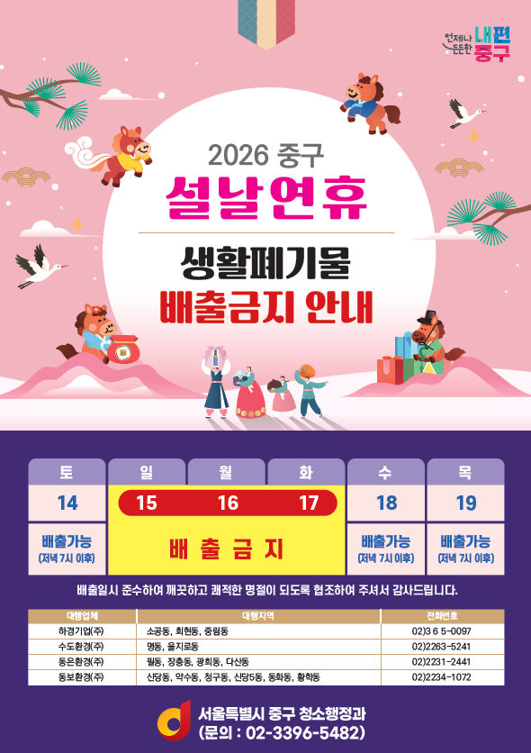 ㅇ 연휴 전·후 노면 청소 및 방치 폐기물 집중 수거 [중구 세계타임즈=이장성 기자] 서울 중구가 설 연휴 동안 주민 불편을 최소화하기 위해 특별 청소대책을 추진한다. 구는 연휴 기간에 청소상황실을 운영하고, 오는 15일부터 17일까지 쓰레기 배출을 금지한다.