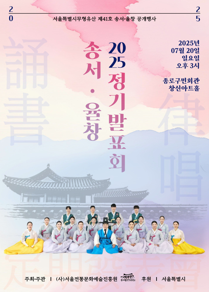먼저 오는 7.20.(일) 오후 3시, 종로구민회관에서 「송서(誦書)」공개행사를 개최한다. 송서는 옛 선비들이 문학 작품에 음률을 넣어 멋스럽게 읽어내며 사대부의 교양을 뽐내던 독특한 서울의 전통 음악이다. 유의호 보유자를 비롯한 이수자, 전수생 등 총 62명이 함께 무대에 올라 송서의 매력을 선보인다.