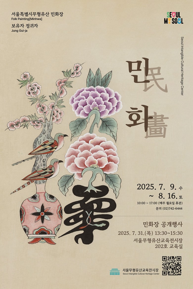 7.31.(목) 오후 1시 30분에는 종로구 서울무형유산 교육전시장에서 정귀자 보유자의 「민화장」공개행사가 열린다. 민화는 서민층에서 유행한 실용적 그림으로 소박하지만 파격적이고, 해학적이면서도 아름다운 옛 서민의 예술 문화를 대표한다.