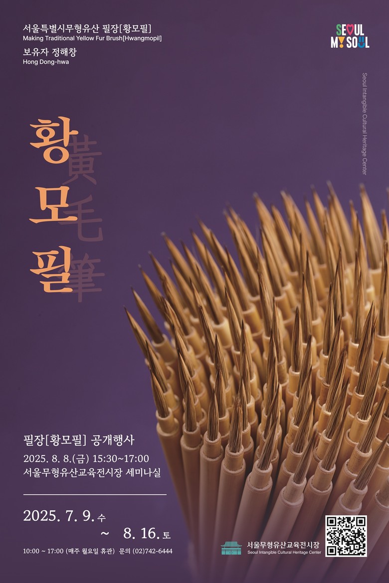 8.8.(금) 오후 3시 30분에는 같은 장소에서 「필장(황모필)」 보유자 정해창의 공개행사가 이어진다. 필장은 붓을 만드는 장인을 말하며 이 중에서도 정해창 보유자는 족제비 꼬리털 등 황색 털을 사용한 ‘황모필’ 붓의 명장이다.