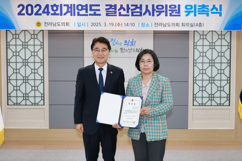 전남도의회는 2024회계연도 결산 검사를 위해 박경미 도의원을 포함한 도의원 3명과 전남도 및 도교육청에서 재무 및 회계 분야 업무를 담당한 전직 공무원 4명, 회계 분야에 전문성을 갖춘 공인회계사 3명 등 총 10명을 결산 검사 위원으로 선임했다.